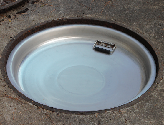 The pan weighs less than 40 pounds and will fit any existing manhole frame (no modification to the frame or vault needed). A stainless steel handle provides fast and easy drop in and lift out.